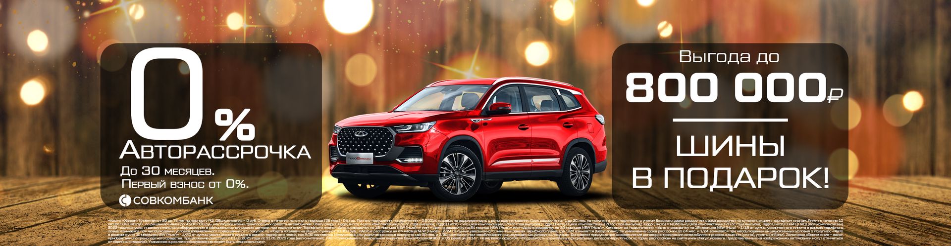 Бренд CHERY представляет новую кредитную программу «CHERY-ЛЕГКО!». Новая кредитная программа сочетается с выгодой по “TRADE IN” (сдача в зачет вашего текущего автомобиля) либо с ПРЯМОЙ выгодой. Ценовое преимущество на модельный ряд кроссоверов CHERY достигает рекордных 800 000 рублей! Предложение ограничено по времени и действует только до 31 января!